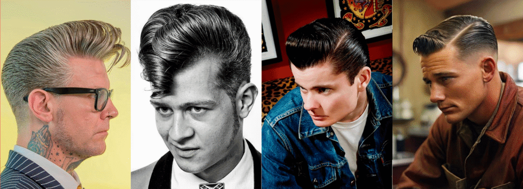 - El pompadour o copete: Es el peinado emblema del género —una mezcla de rebeldía y elegancia popularizada por íconos como Elvis Presley, Eddie Cochran y Gene Vincent. El cabello se peina con volumen al frente, usando brylcreem, pomadas o ceras que aportan brillo y fijación. Se combina con patillas largas, líneas bien marcadas y laterales rebajados.