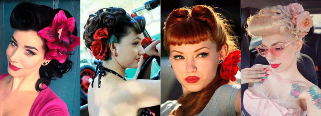 Inspiradas en estrellas de la época como Bettie Page, Marilyn Monroe o Dita Von Teese, los estilos más comunes son los victory rolls, ondas suaves y flequillos perfectamente recortados.