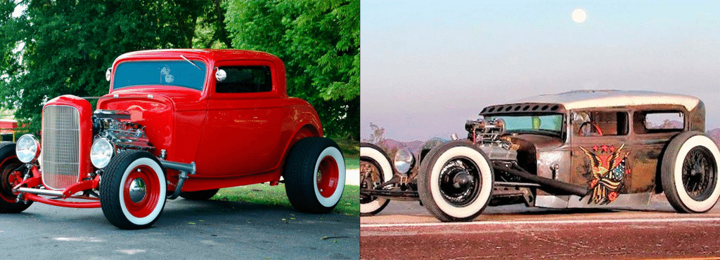 Los Hot Rods son los vehículos más emblemáticos dentro de esta escena. Nacidos en la posguerra estadounidense, eran autos antiguos —generalmente Ford de los años 30 y 40— modificados por jóvenes entusiastas para correr más rápido y destacar con diseños personalizados.