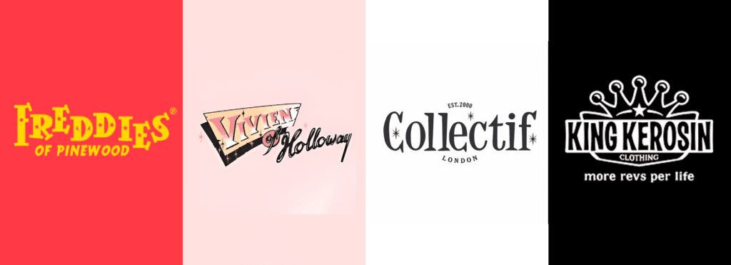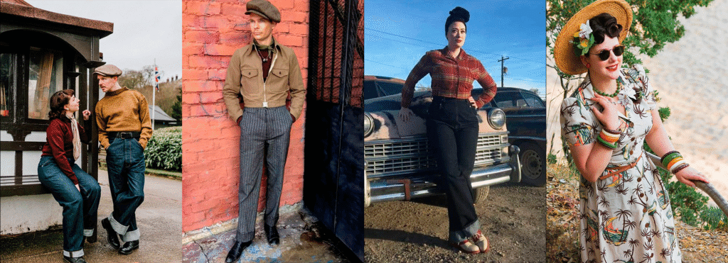 Tiendas especializadas en ropa retro —tanto original como reproducción— ofrecen prendas inspiradas en los cortes, telas y estampados de los 40s y 50s: jeans de talle alto, vestidos con vuelo, camisas bowling, chamarras de cuero, zapatos saddle y gafas cat-eye.