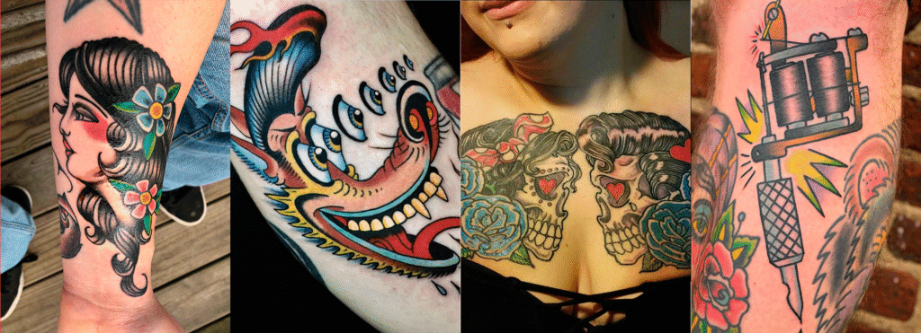 Los estilos más representativos son los tatuajes tradicionales americanos (Old School), caracterizados por líneas gruesas, colores sólidos y temáticas icónicas de los años 40 y 50.